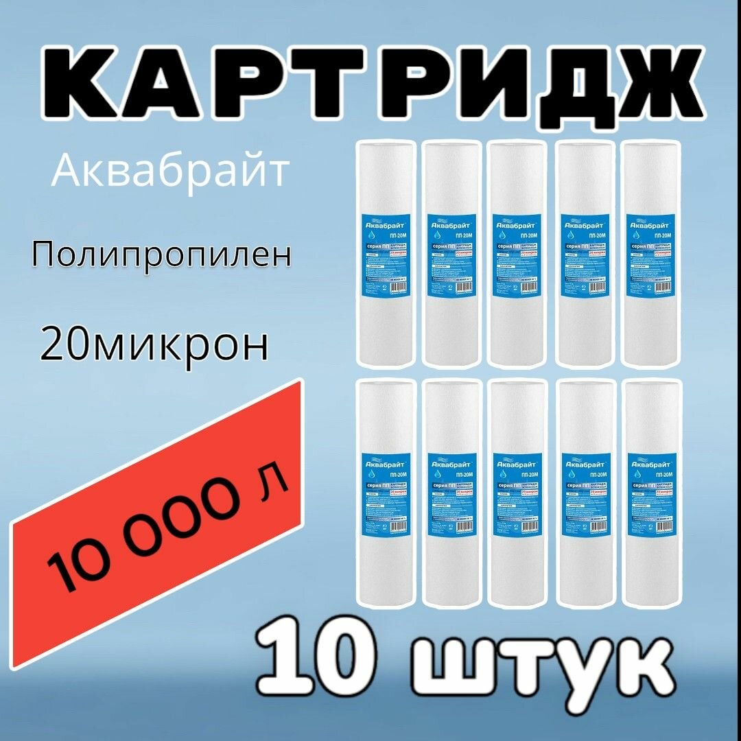 Картридж для воды Картридж для очистки воды полипропиленовый аквабрайт ПП-20М (10 штук),для фильтра , 20 микрон
