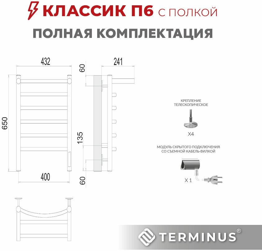 Полотенцесушитель электрический с полкой TERMINUS (Терминус) Классик с полкой П6 400х650 мм,нержавеющая сталь, диммер Quick Touch, гарантия 5 лет 12 190 ₽ Подробнее