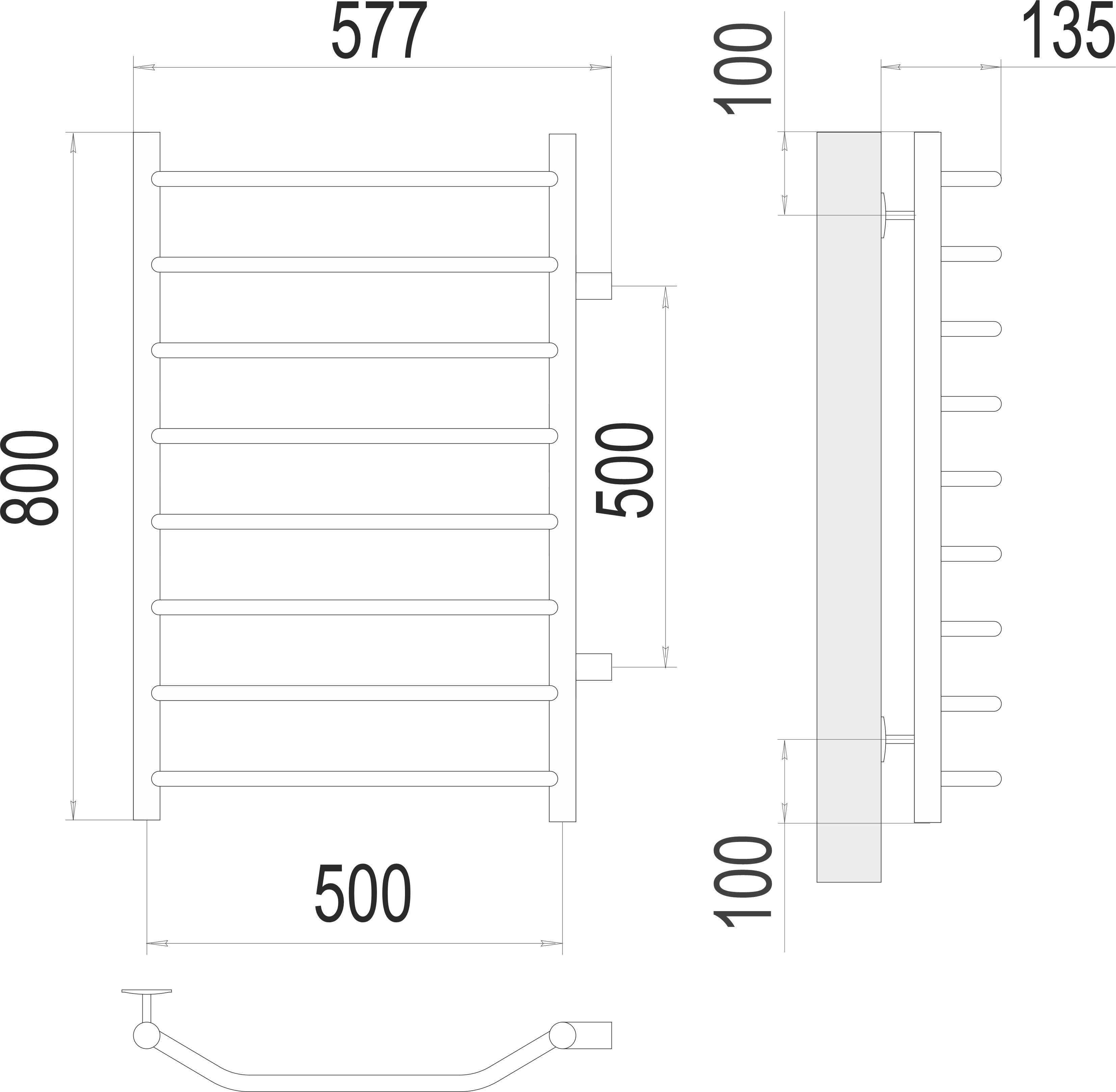 Полотенцесушитель TERMINUS Виктория П8 (ШВ:577x800) водяной, нерж.сталь, боковое подкл., м/о 500мм