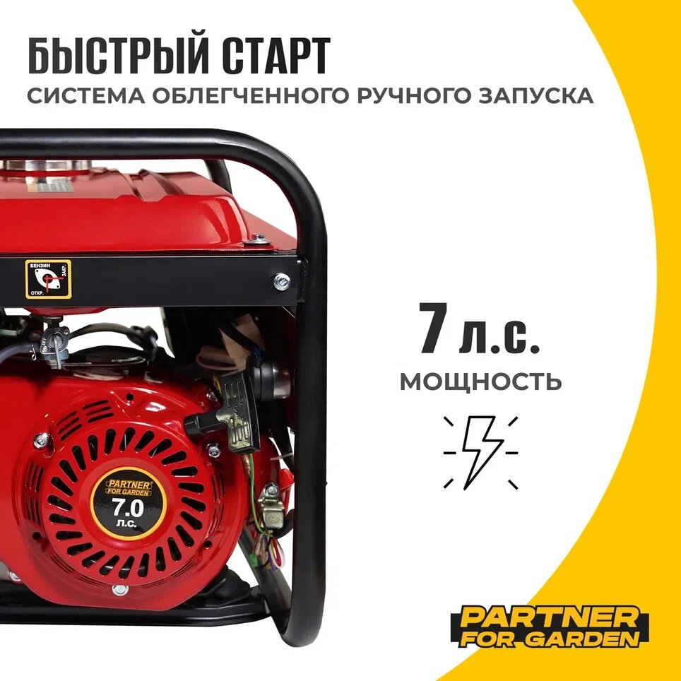 Бензиновый генератор Partner for garden 4000 ( 4,4 кВа максимальная нагрузка , 220 В / 12 В, 3 / 3,5 кВт, 50 Гц, 7 л.с, 4 тактный двигатель )