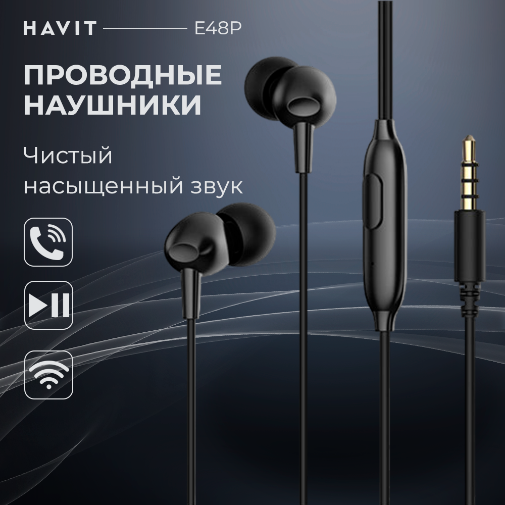 Наушники Проводные наушники HAVIT E48P с микрофоном, для телефона, jack 3.5, черные