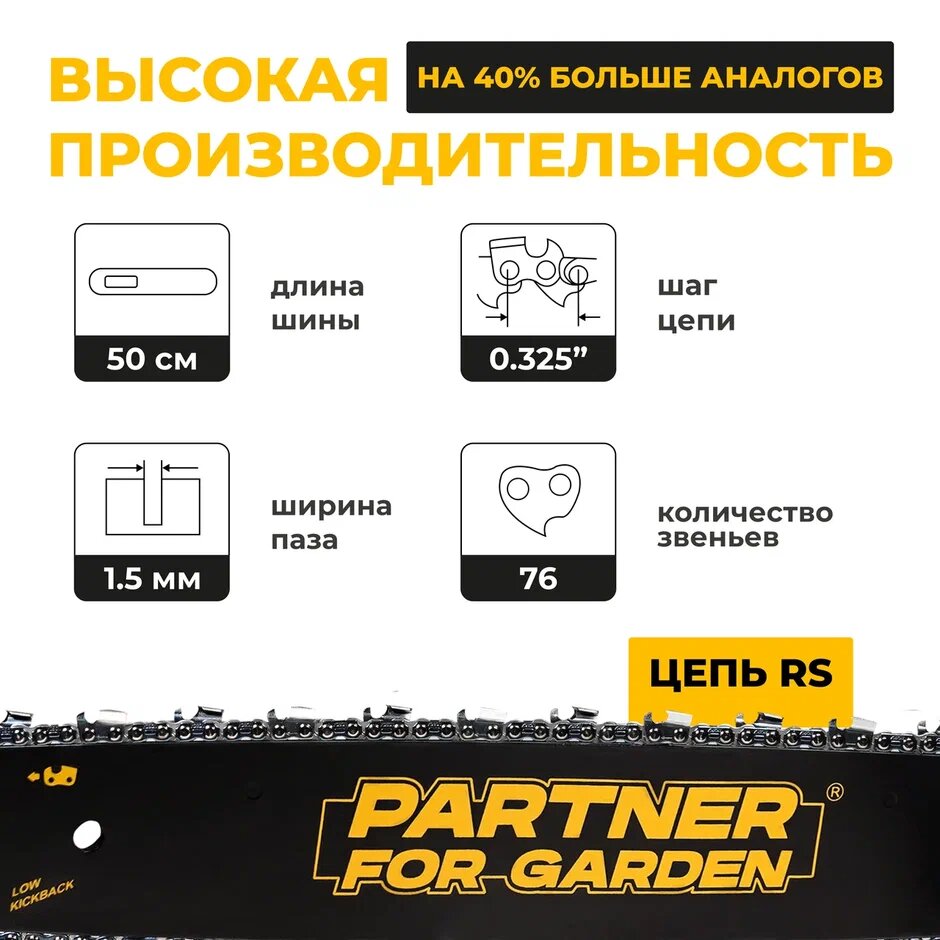 БензопилаPartner for Garden GS 520P (3,5 л.с, 2,4 кВт, объем двигателя 49,3 см3 , длина шины 20" - 50 см) 8 132 ₽ Подробнее
