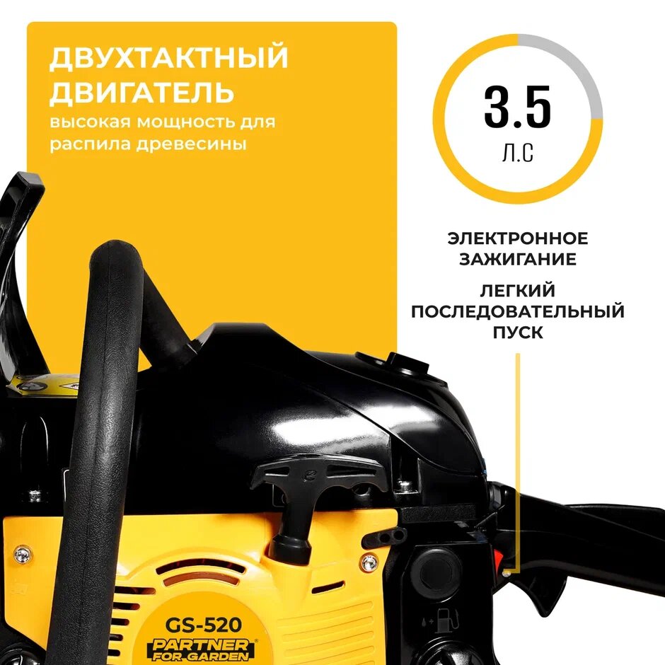 Пилы Бензопила / Бензопила бензиновая / Пила Partner for Garden GS 520P ( 3,5 л.с, мощность 2,4 кВт, объем двигателя 49,3 см3 , длина шины 20" - 50 см )