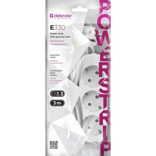 Удлинитель Defender E330, 3 розетки, с заземлением, 3м, белый