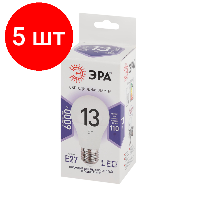 Лампочки Комплект 5 штук, Лампа светодиодная ЭРА LED A60-13W-860-E27 13Вт Е27 6000К Б0031395