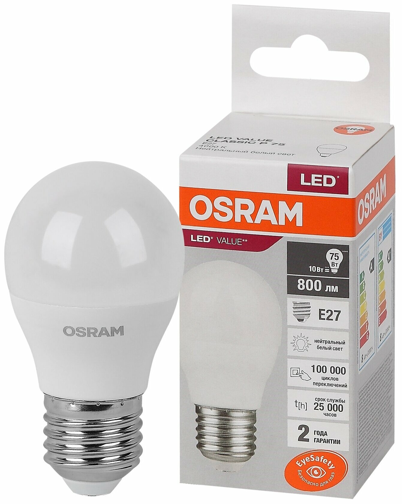 Лампа светодиодная LED 10 Вт E27 4000К 800Лм шарик 220 В (замена 75Вт) | код 4058075579927 | LEDVANCE (7шт.в упак.)
