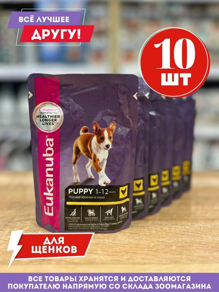 Корм влажный (паучи) Eukanuba Puppy для щенков в возрасте от 1 до 12 месяцев с кусочками курицы в соусе, 85 г х 24 шт