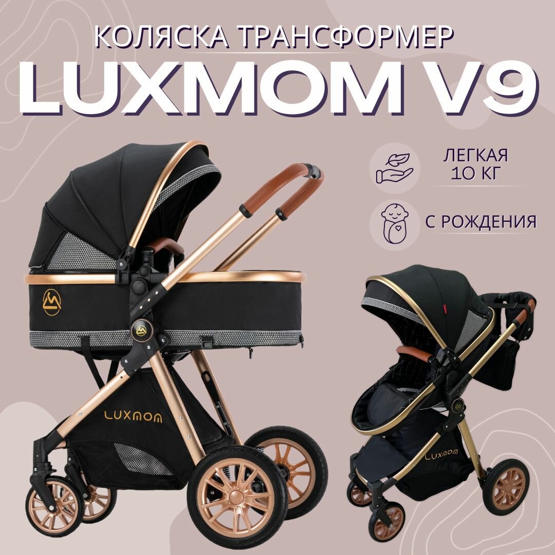 Детская коляска трансформер 2 в 1 LUXMOM V9 / для новорожденных / люлька и прогулка / с рождения до 3-х лет / Чёрная / 2023