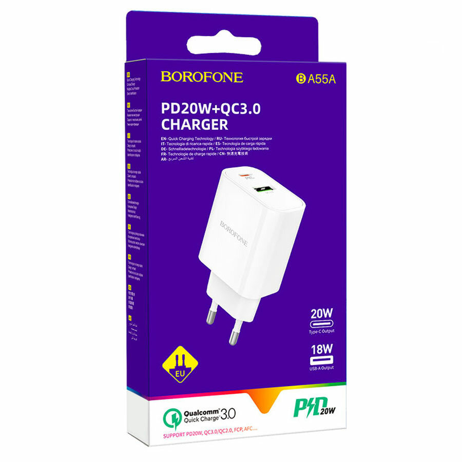 Зарядка для телефона BOROFONE BA55A Crown Speed 1xUSB QC3.0, 3A, 1хUSB-C PD, 20W (белый)