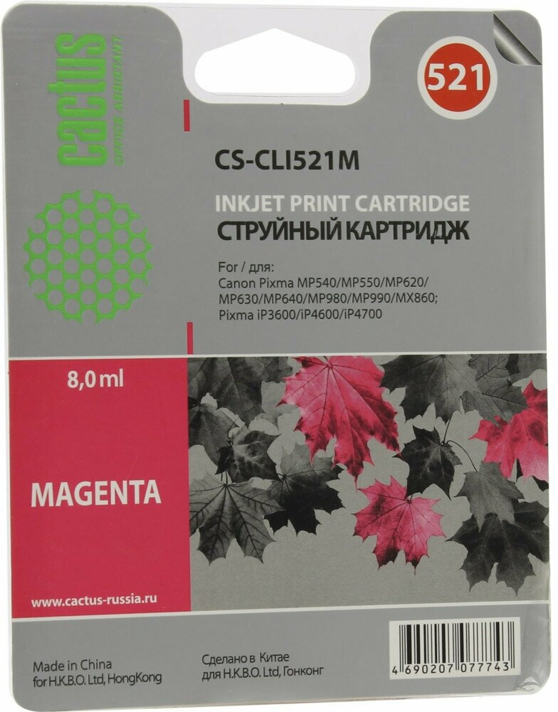 Картридж струйный Cactus CS-CLI521M пурпурный (8.4мл) для Canon Pixma MP540/MP550/MP620/MP630/MP640/MP980/MP990/MX860/iP3600/iP4600/iP4700