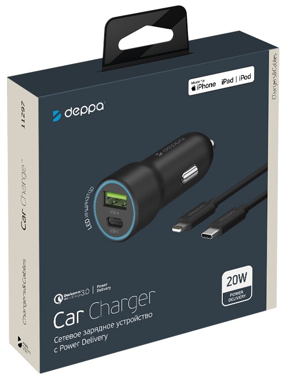 Автомобильное зарядное устройство DEPPA USB-C + USB A, PD 3.0, QC 3.0, 20W, дата-кабель USB-C - Lightning (MFI), 1.2м, черный