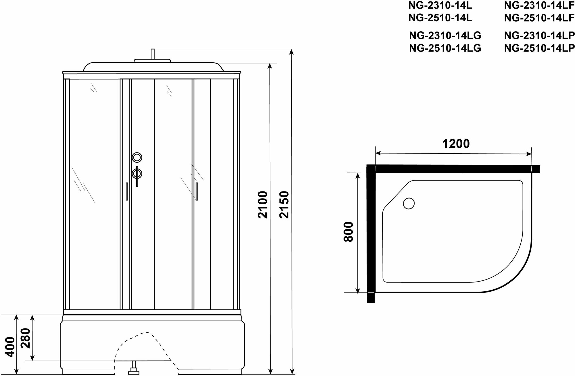 Душевая кабина ng-2510-14lbkt (1200х800х2100-2400) высокий поддон(40см) стекло тонированное