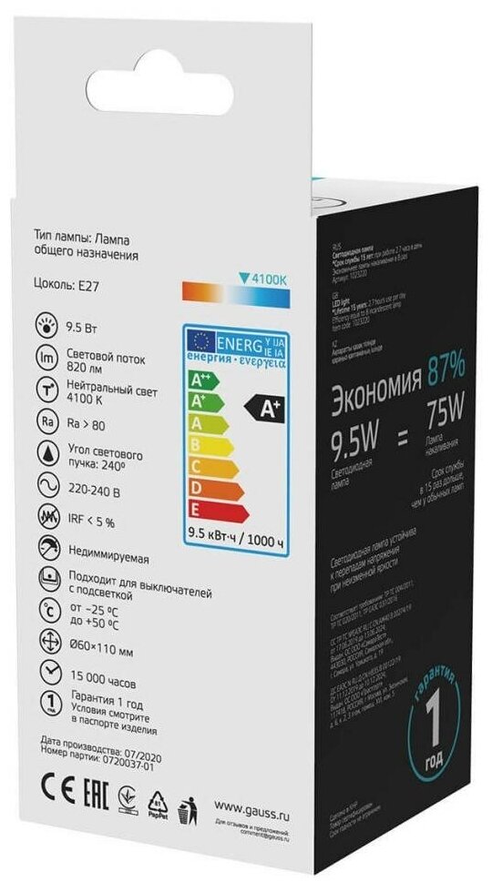 Лампочки Светодиодная лампа Gauss Basic A60 9,5W 820lm 4100K E27 LED 1/10/50