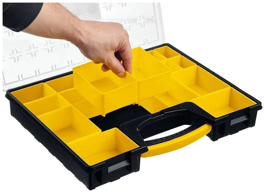 Лучшие цены. Пластиковый кейс удобной формы для переноски, хранения мелких крепежей и расходников. Кейс закрывается на крепкую защелку из ударопрочного пластика. Все содержимое можно разглядеть и найти необходимое не открывая ящик. Для переноски используется эргономичная рукоятка. Магазины в вашем городе.