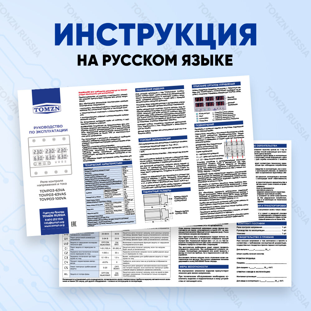Реле напряжения Реле контроля напряжения TOMZN TOVPD3-63VA 4P трехфазное с защитой от перегрузки по току и перенапряжения 63 А / Устройство в DIN рейку