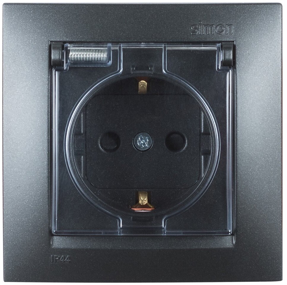 Розетка с рамкой Simon 15 1590450-038 скрытая установка графит с заземлением IP44 со шторками с крышкой