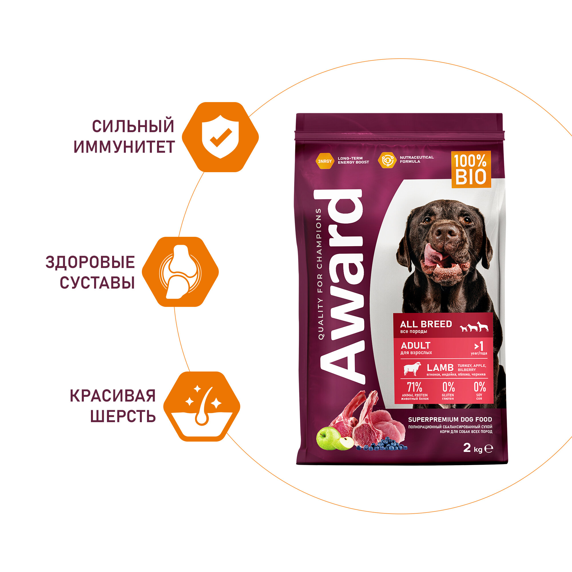 Корм для собак Сухой корм AWARD для взрослых собак всех пород с ягненком и индейкой с добавлением яблока и черники 2кг