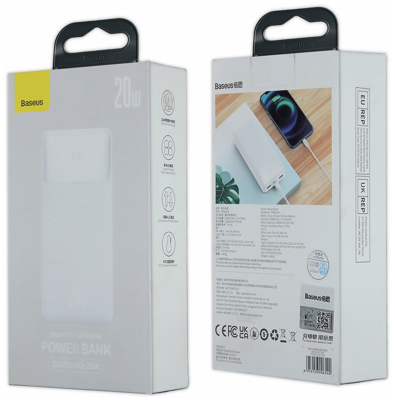 Портативный аккумулятор Baseus Bipow Digital Display Power bank 20000mAh 20W, белый, упаковка: коробка