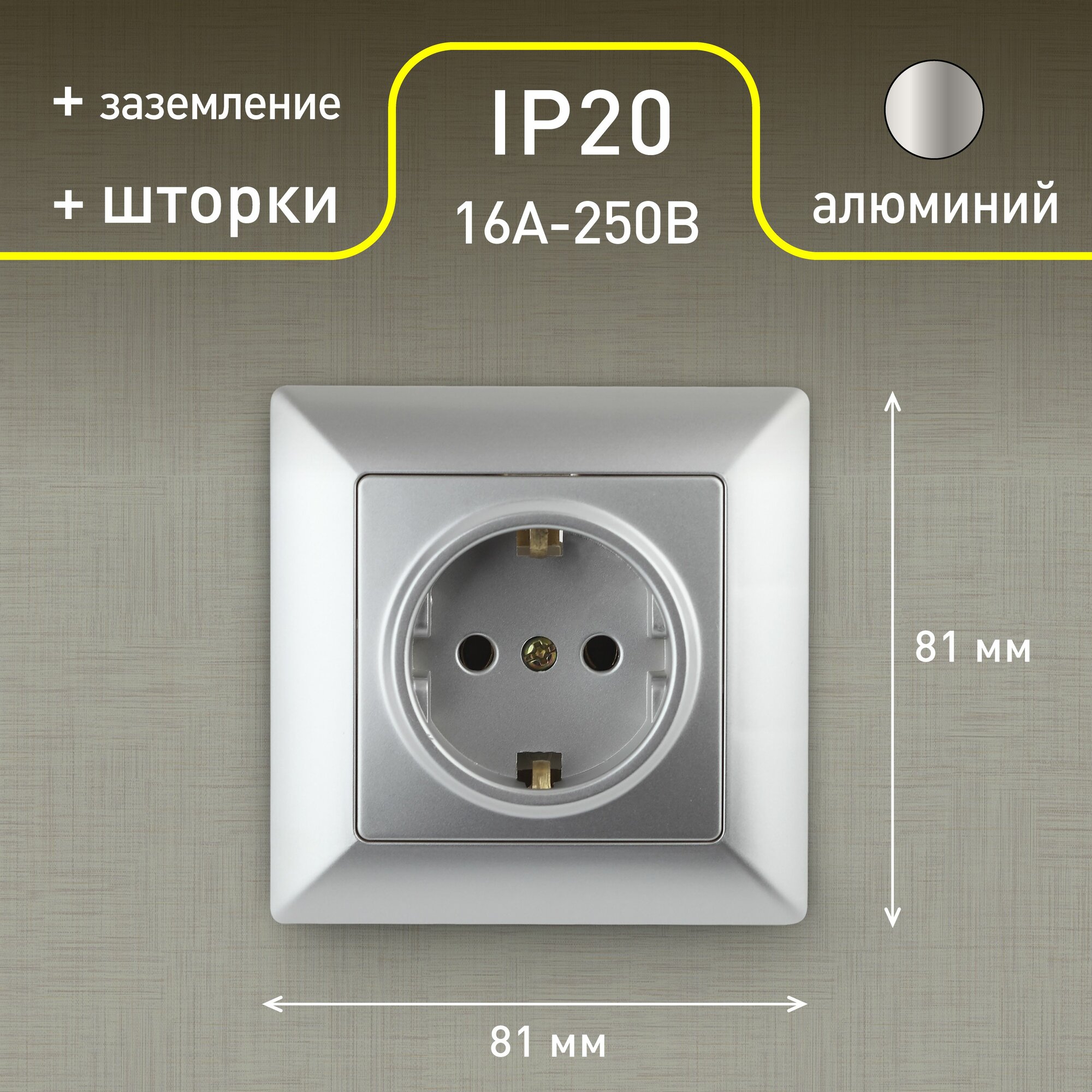 Розетка Intro Solo 4-206-03 с заземлением 2P+E Schuko со шторками, 16А-250В, IP20, СУ, алюминий арт. Б0053683 (1 шт.)