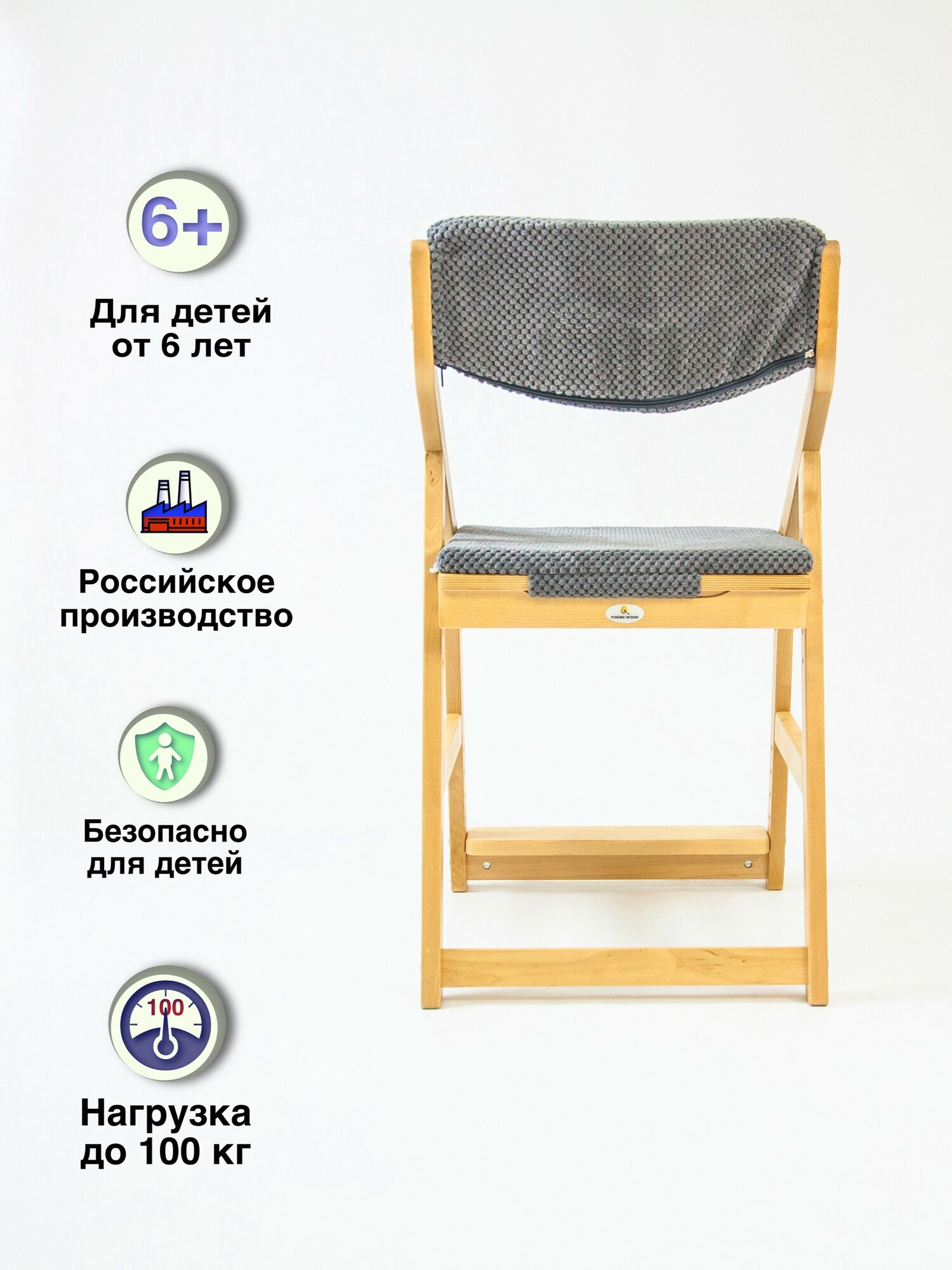 Детский растущий стул Робин Wood с подушками (38 Попугаев), цвет: Выбеленное дерево, Серый