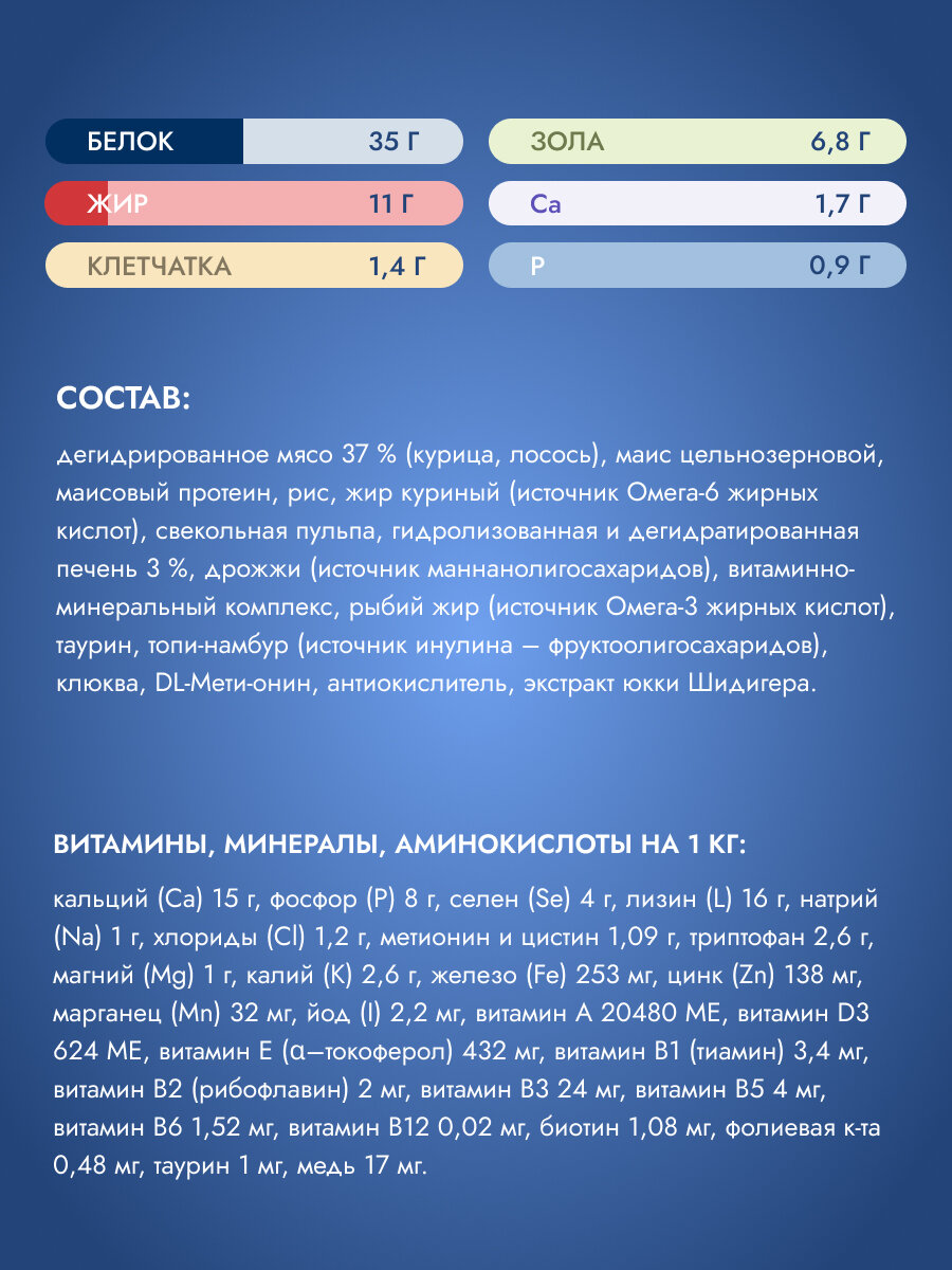 | Ингредиенты | рыбная мука, кукурузный белок, кукуруза, пшеница, рис, жир |