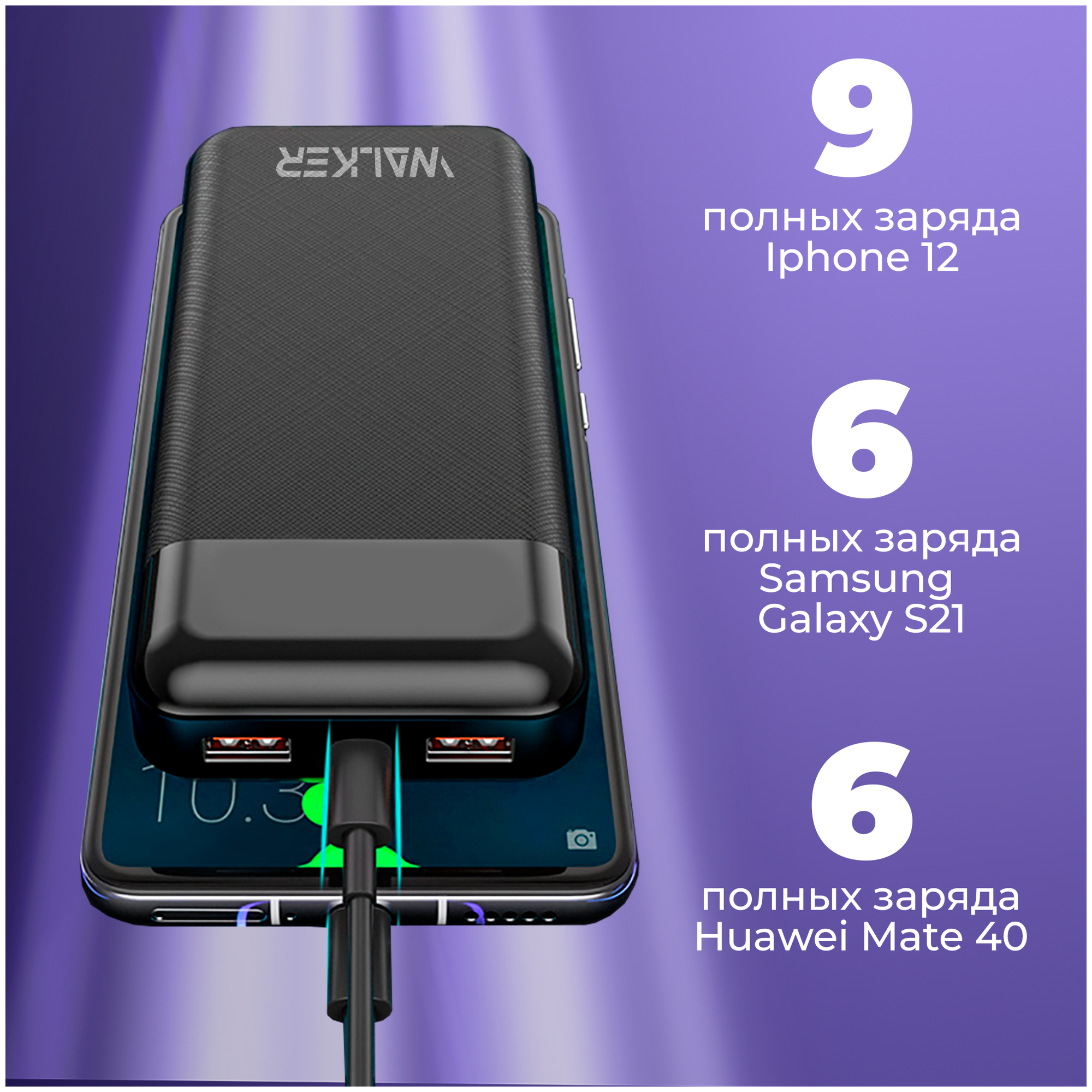Внешний аккумулятор power bank 20000 mAh, WALKER WB-525, портативная зарядка, повербанк для xiaomi, пауэр банк для redmi, пауэрбанк для iphone, черный