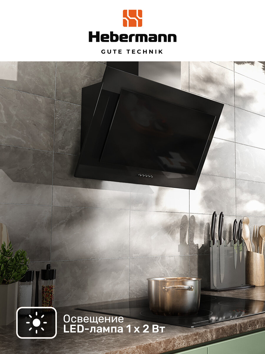 Наклонная кухонная вытяжка Hebermann HBKH 60.5 B, 60 см, черная, кнопочное управление, LED лампы, отделка- окрашенная сталь, стекло, производительность 700 м³/ч 9 099 ₽ Подробнее