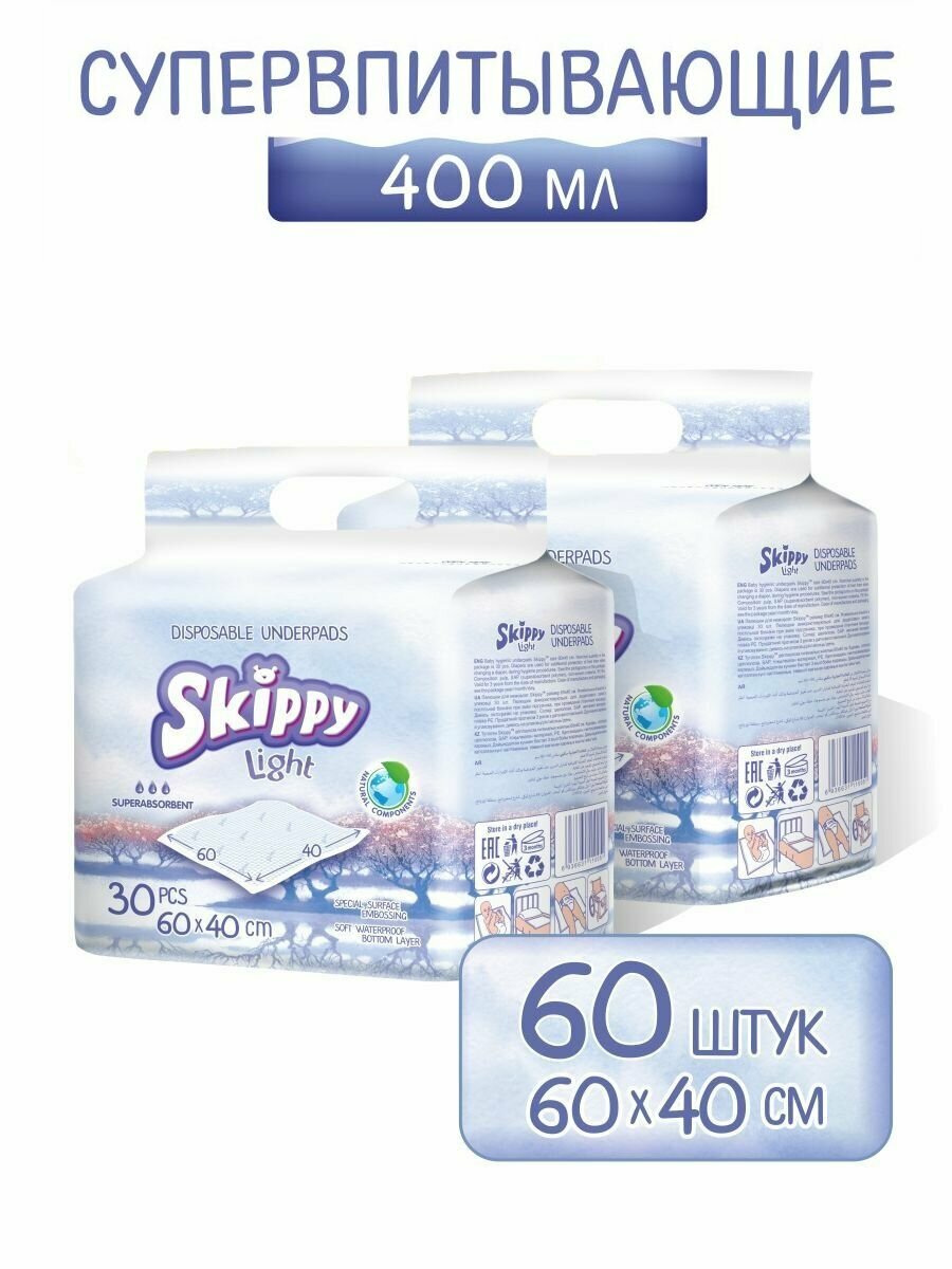 Подгузники Пеленки одноразовые Skippy Light впитывающие, 60х40, 60шт. (2 х 30шт.)