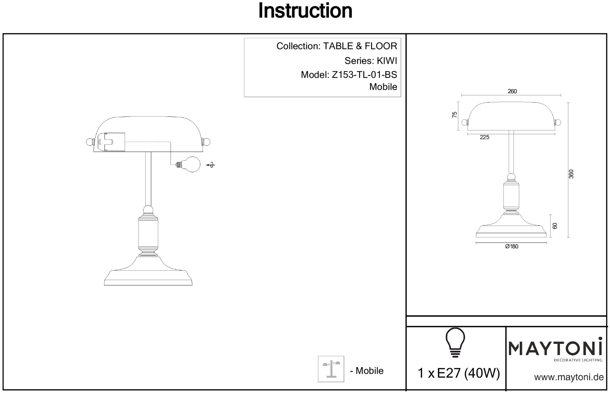 Лучшие цены. Настольная лампа Z153-TL-01-BS производства Maytoni (Германия) из коллекции Kiwi выполнена в стиле классика. Арматура светильника выполнена из металла цвета латунь. Поверхность арматуры матовая. Плафон изготовлен из стекла зеленого цвета, имеет овальную выпуклую форму и матовую поверхность. Направлен вниз. Осветительный прибор рассчитан на освещение пространства площадью 2 кв. м. Тип цоколя используемых ламп E27. Производитель рекомендует использовать лампы мощностью не более 40 Вт. Магазины в вашем городе.