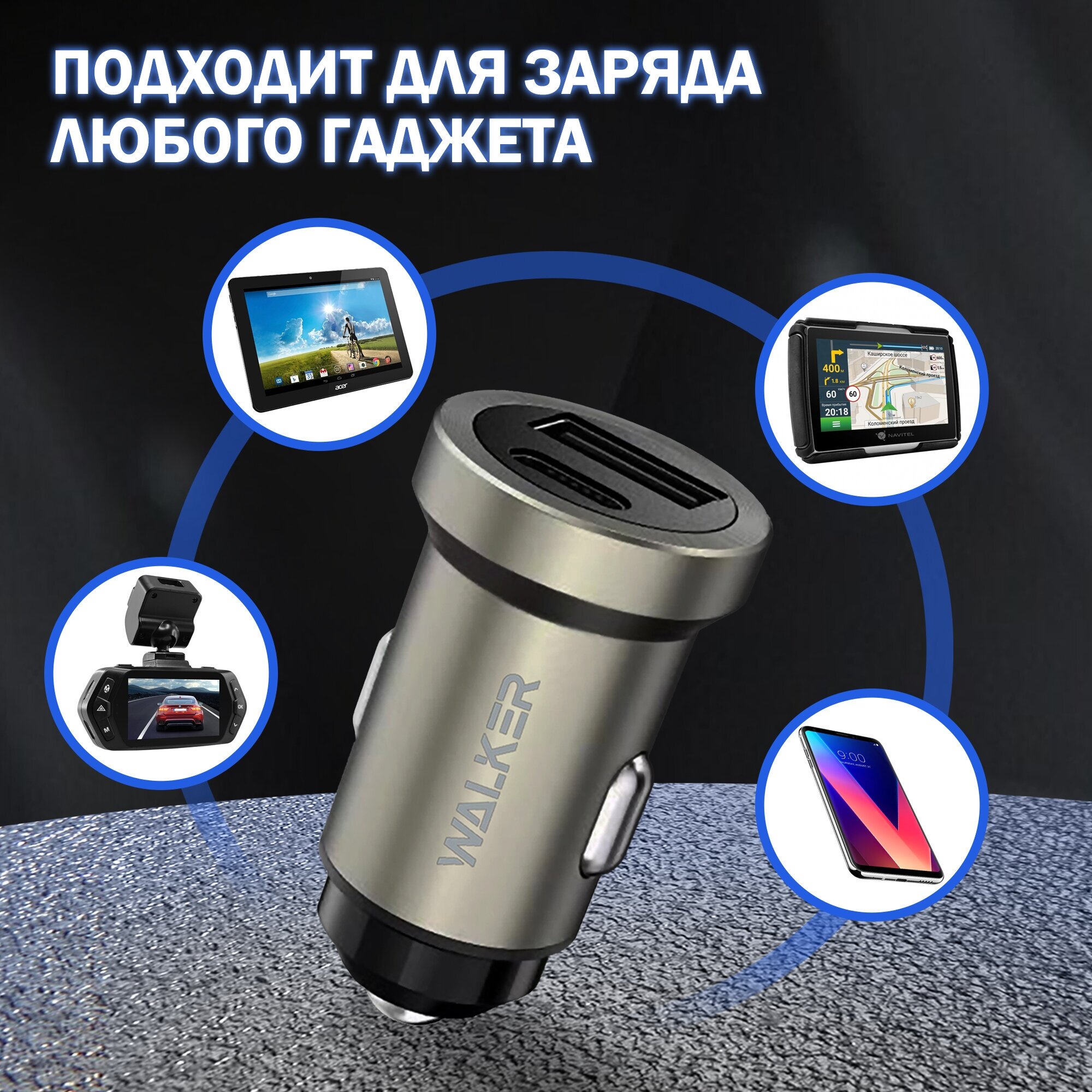 Автомобильная зарядка для айфона, WALKER, WCR-25, с быстрым зарядом, USB+TypeC разъемы, 36W, зарядное устройство на телефон samsung, серая