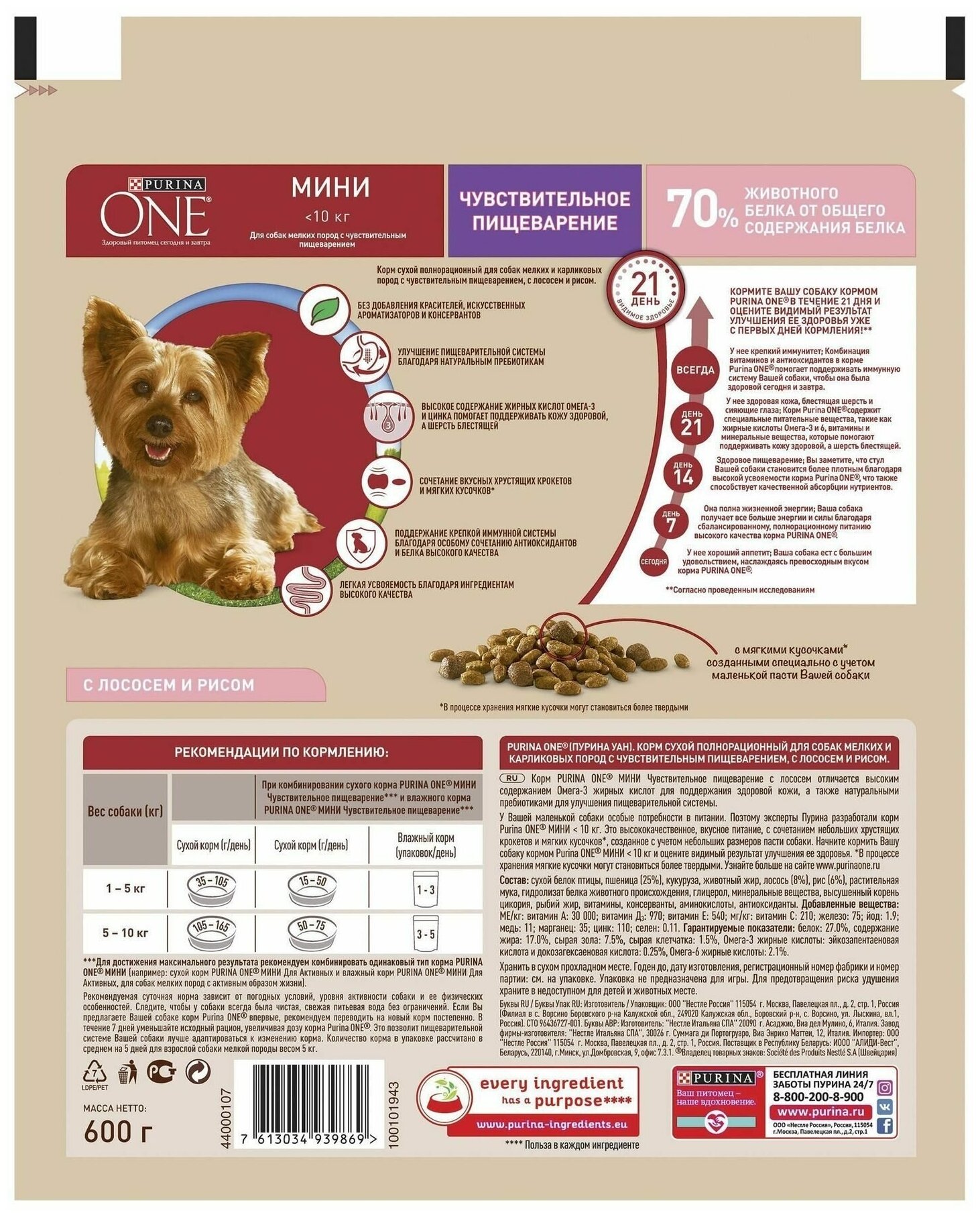 PURINA ONE мини чувствительная для взрослых собак маленьких пород с чувствительным пищеварением с лососем и рисом (0,6 кг)