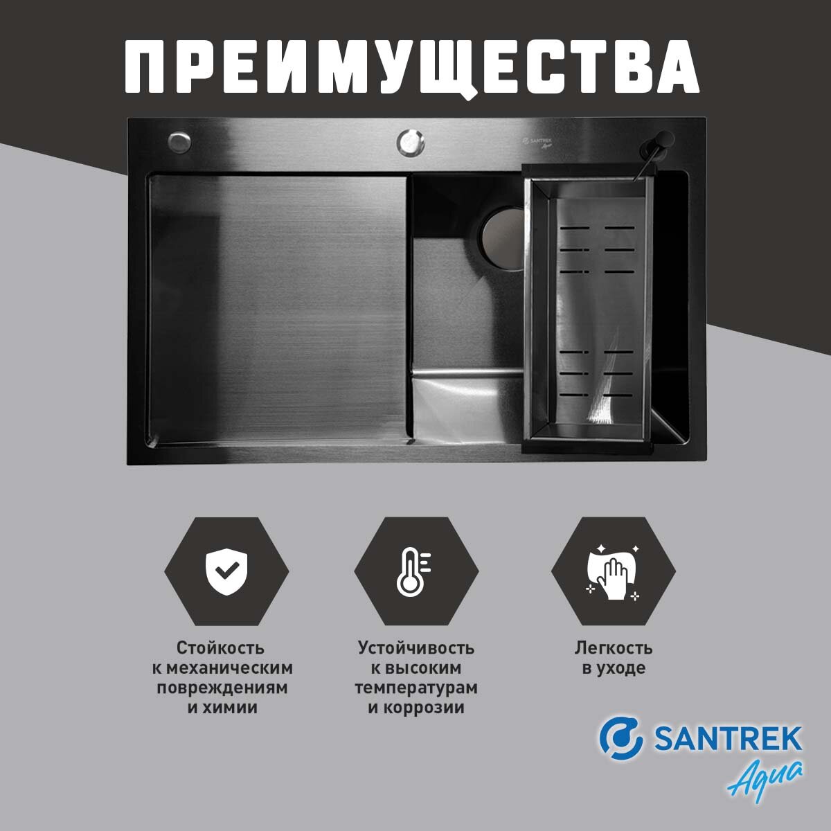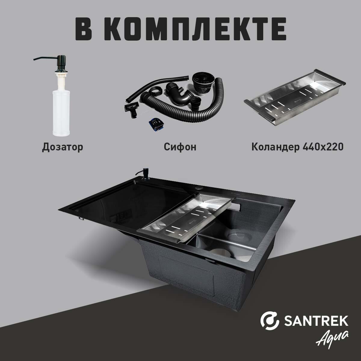Кухонные мойки Мойка нержавеющая врезная SANTREK AQUA 780х480х220 т 3,0 графит D7848HRB правая (+ сифон+дозатор + коландер 420х220)