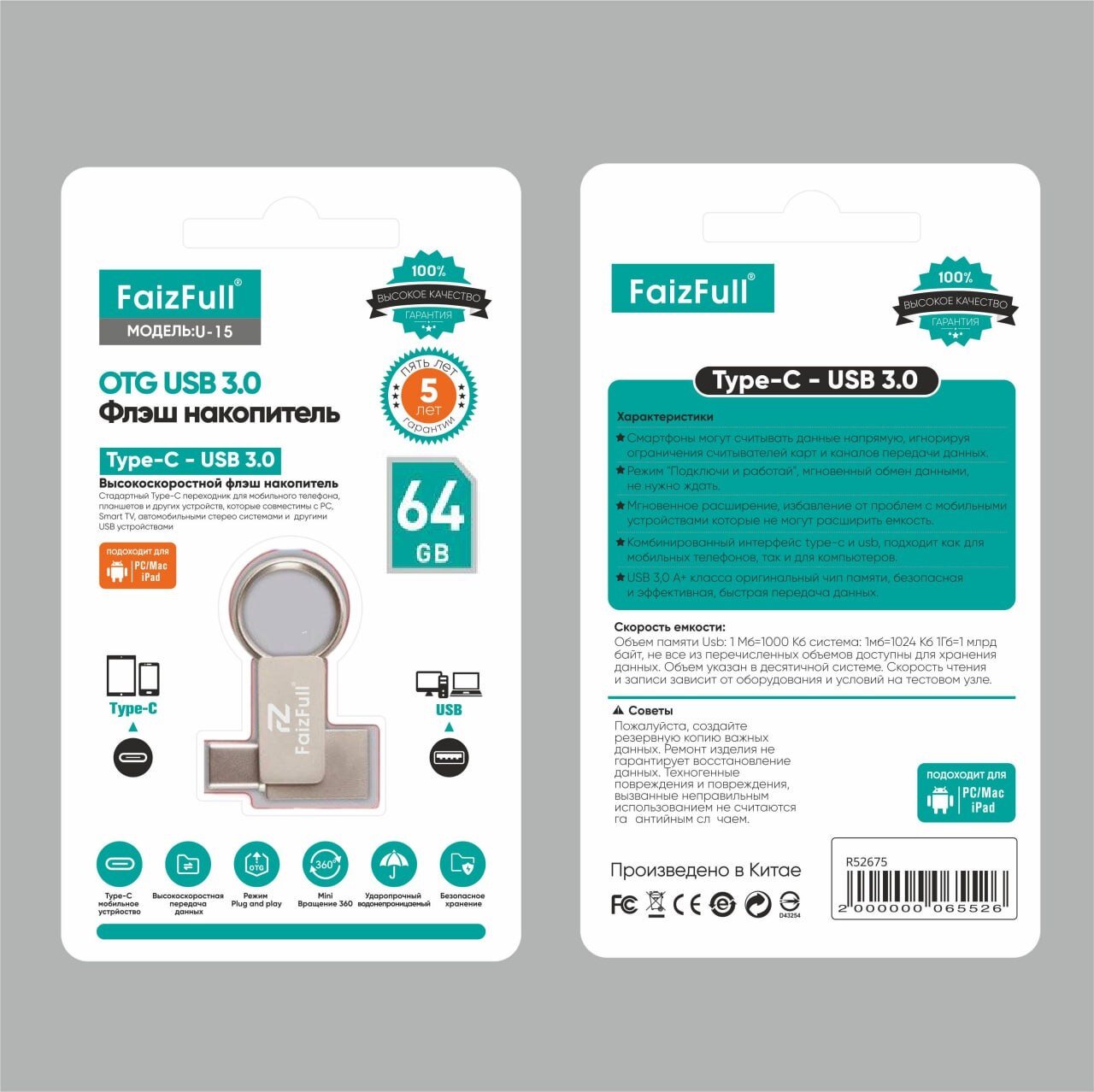 USB-флешки USB Флеш-накопитель Type-C + USB 3.0 64 GB металлический корпус / вращение на 360 градусов / защита данных
