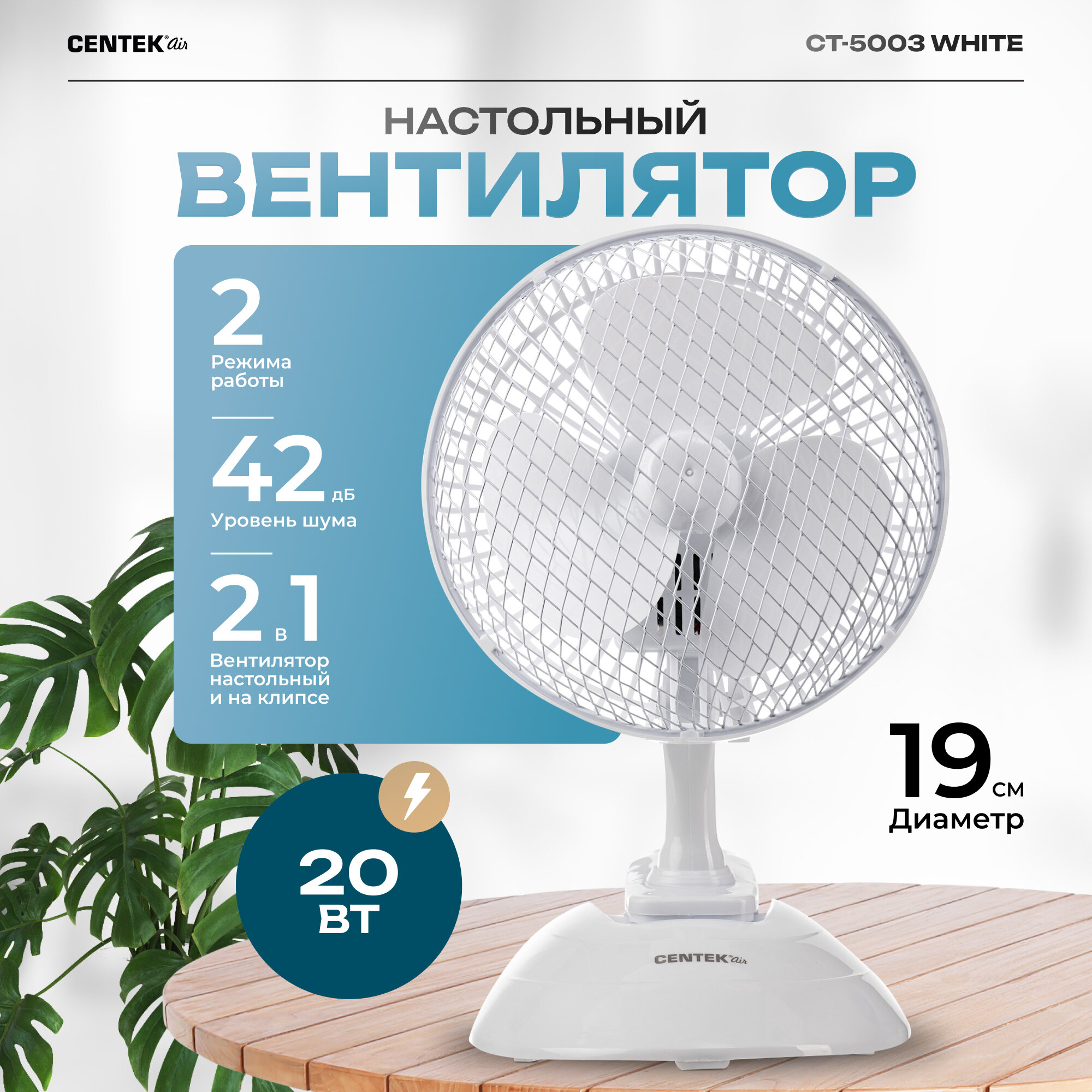 Вентилятор настольный Centek CT-5003 Белый, диаметр 19 см, металлическая решётка, клипса