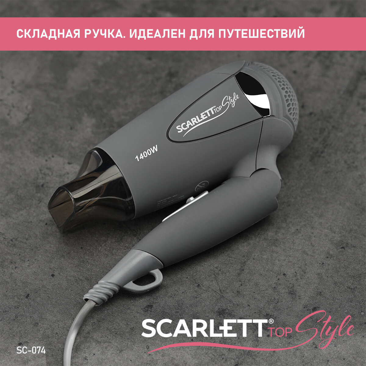 Фен SCARLETT SC-074 1400Вт ионизация складная ручка серый