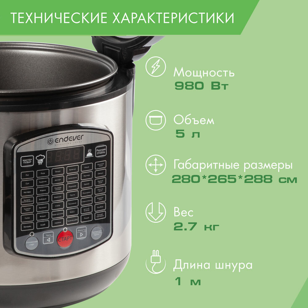 Мультиварка Endever Vita 90 мощностью 980 Вт, с антипригарной чашей на 5л, 42 авторежима работы, мастер повар, таймер до 24 часов, автоподогрев, стальной корпус, регулировка времени/темпа приготовления