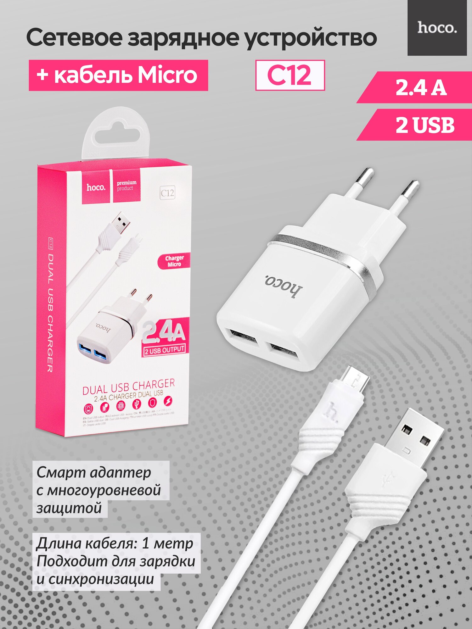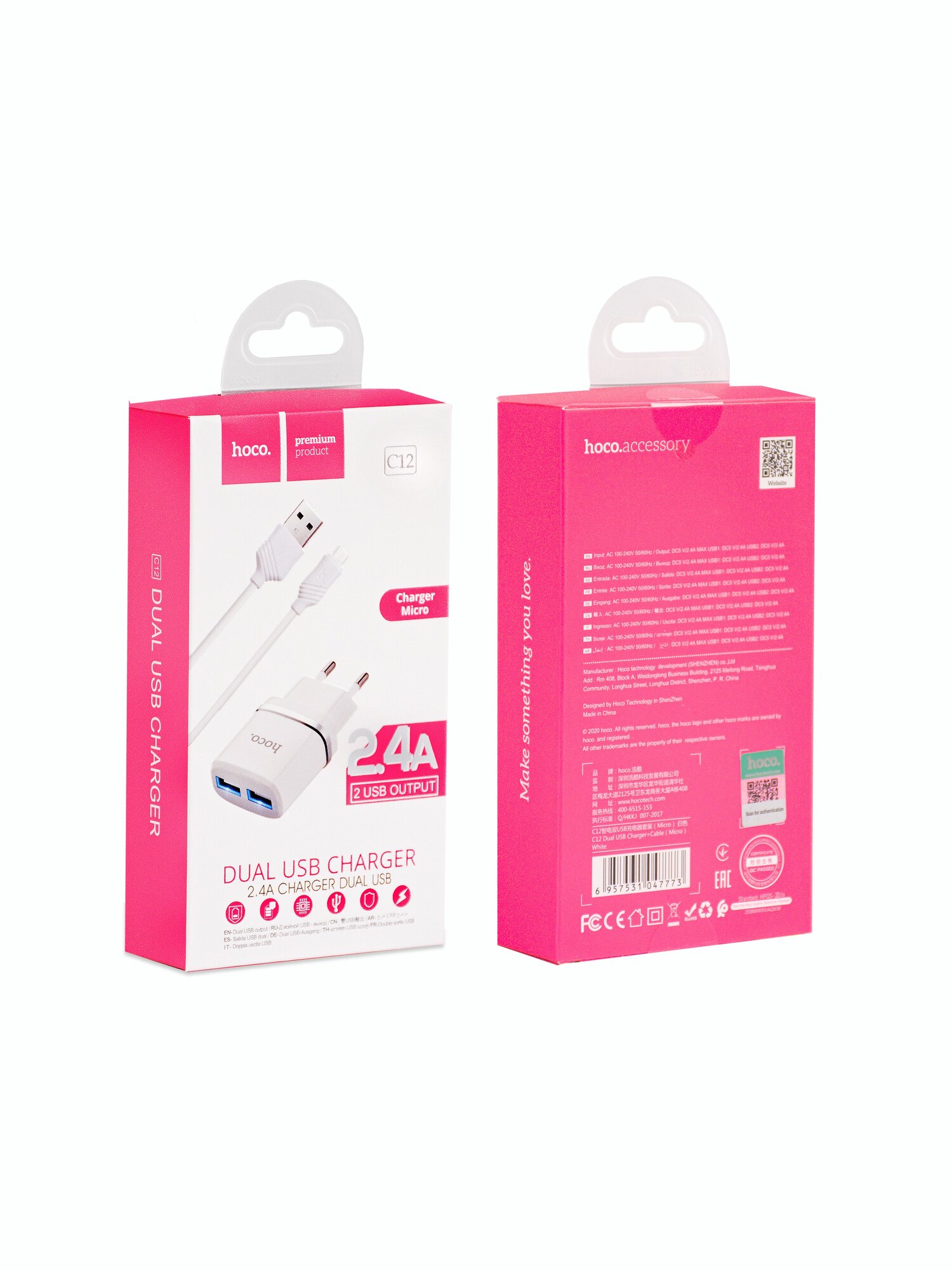 Сетевое зарядное устройство (СЗУ) Hoco C12 (2 USB) + кабель MicroUSB, 2.4 А, белый