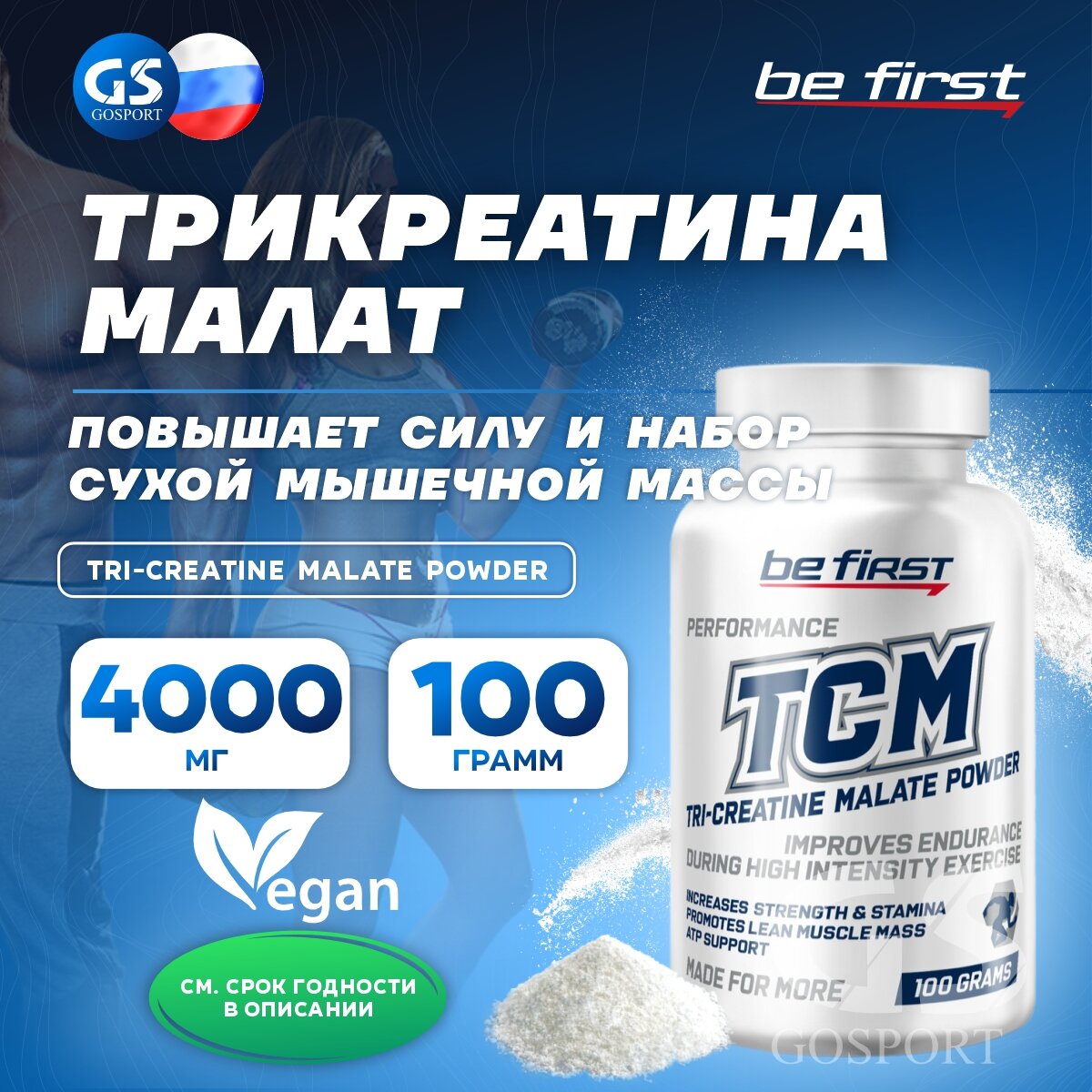 Три креатин малат Be First, TCM Tri-Creatine Malate Powder, 100 г / Рост мышечной массы и силовых показателей / Восстановление мышц