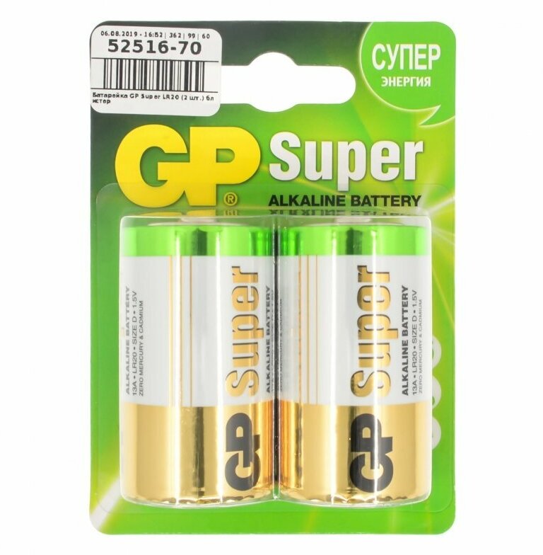 Лучшие цены. Батарейки GP Super Alkaline D (LR20), 2 шт. (13A-2CR2) Серия мощных батареек Super Alkaline разработана компанией GP специально для приборов с повышенным энергопотреблением. Эти батарейки отлично подходят для детских игрушек, часов, игровых консолей, фонарей, портативных радиоцентров и множества других устройств. В отличие от солевых батареек, алкалиновые служат в несколько раз больше, а также дольше сохраняют свой функционал – пять лет вместо двух. Магазины в вашем городе.