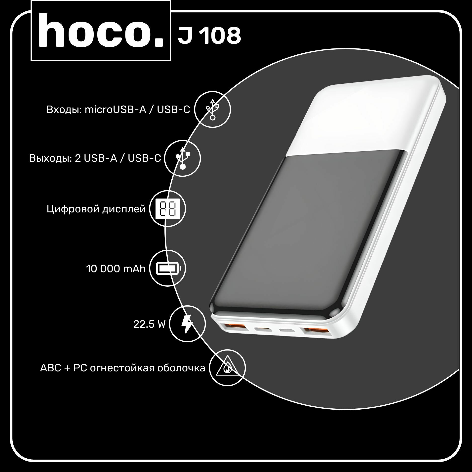 Powerbank Универсальный Доп. Аккумулятор 10000mAh, J108, HOCO, выход: 1 USB (22.5W)+1 PD (18W), белый