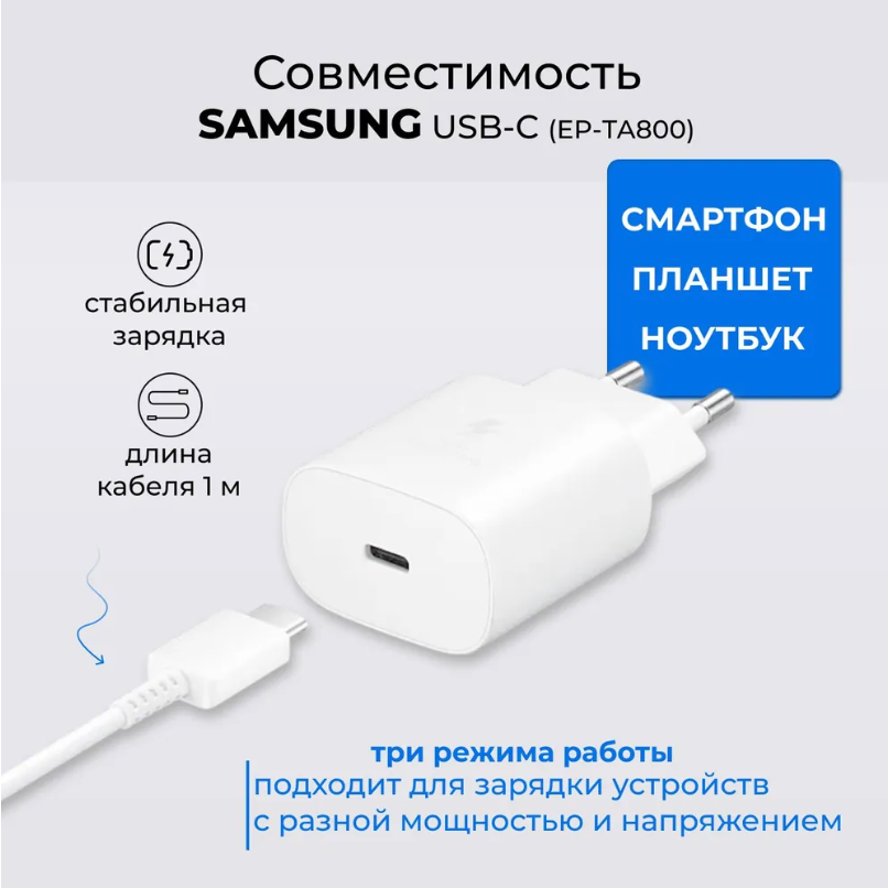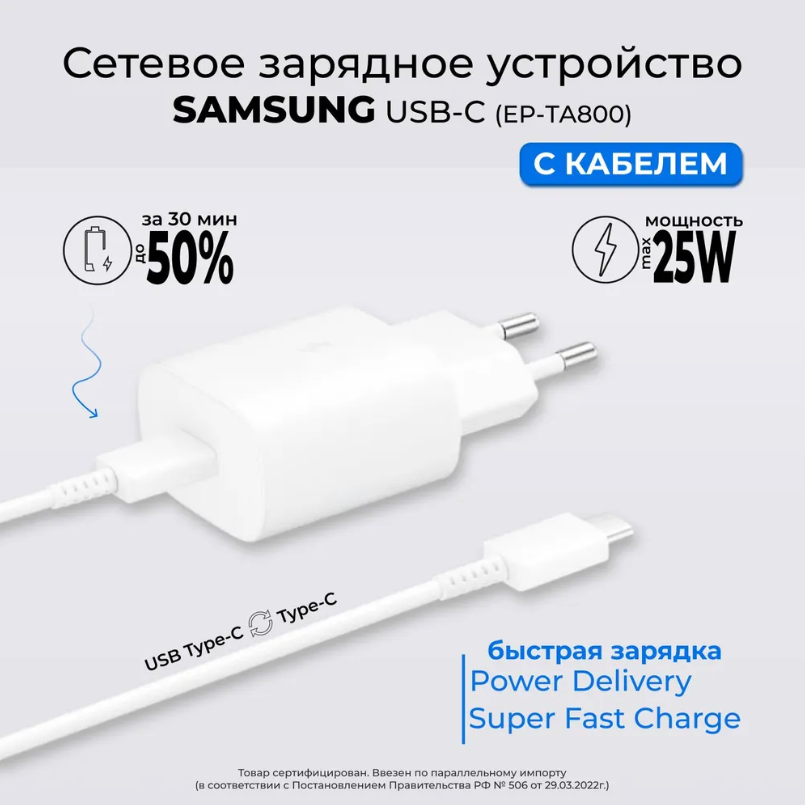 Сетевое зарядное устройство Samsung EP-TA800, 25 Вт, с кабелем USB-C, 1 м, белый