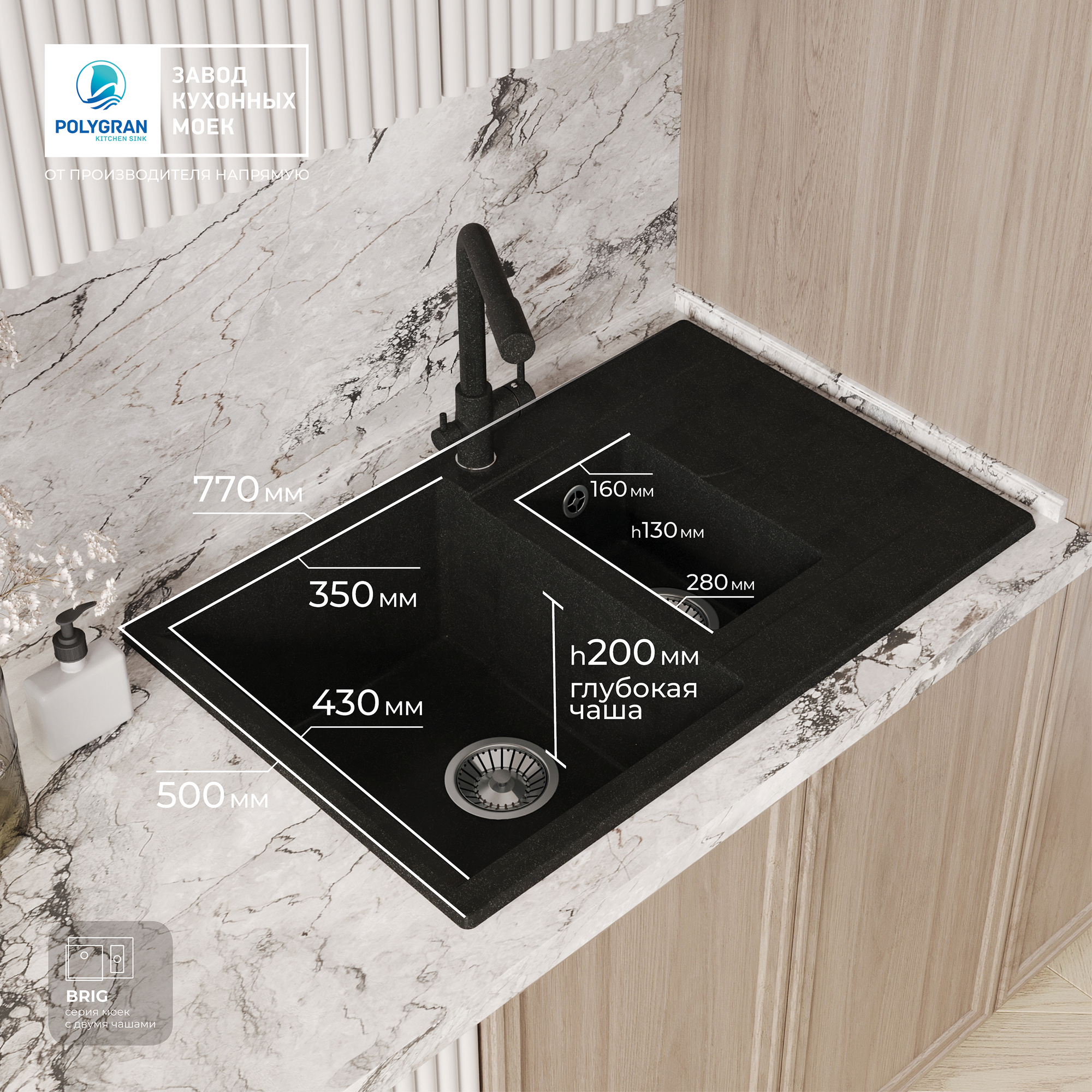 Polygran BRIG-770, мойка, мрамор, черный 16