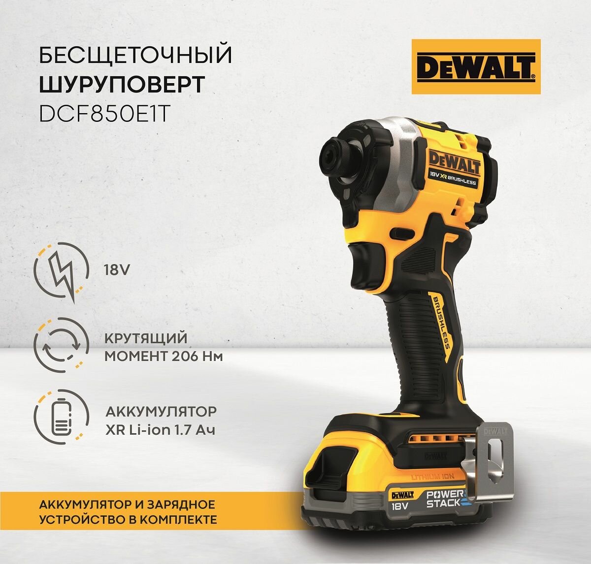 Аккумуляторный импульсный шуруповерт DEWALT, 18 В, 206 Нм, 3800 уд/мин, 3250 об/мин, с 2 АКБ 1.7 Ач и ЗУ, в кейсе TSTAK, DCF850E2T