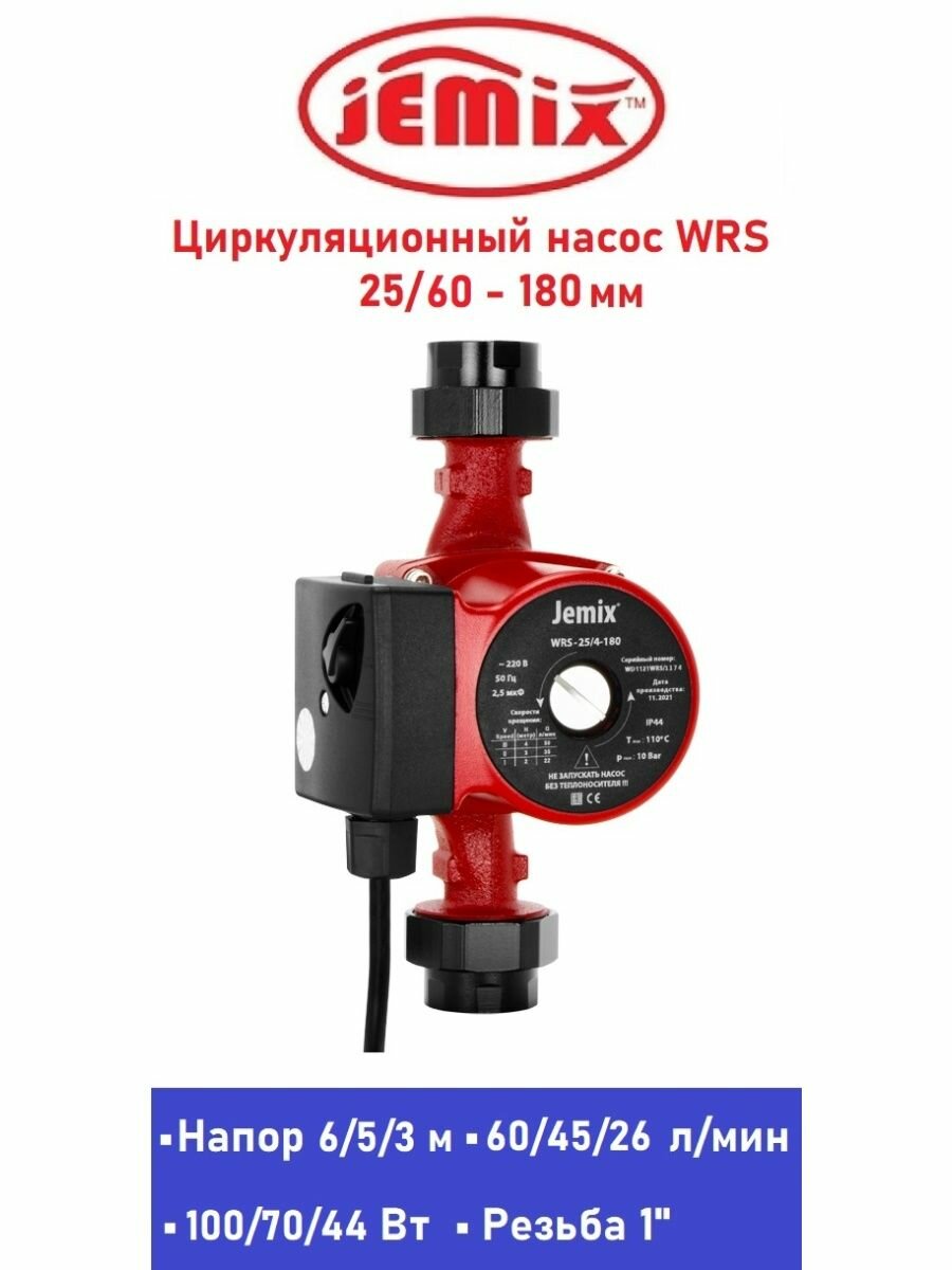 Насос циркуляционный JEMIX WRS-25/6-180 для отопления с кабелем 60 см с вилкой, гайки в комплекте