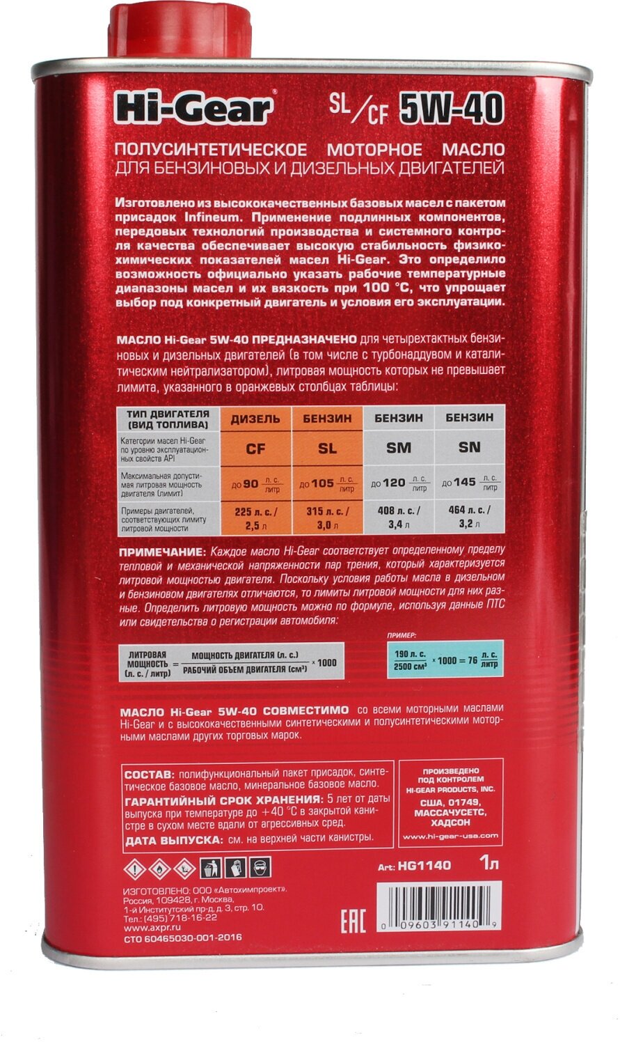 Масло моторное "hi-gear" 5w40 sl/сf (1 л) п/синт. Hi-Gear HG1140