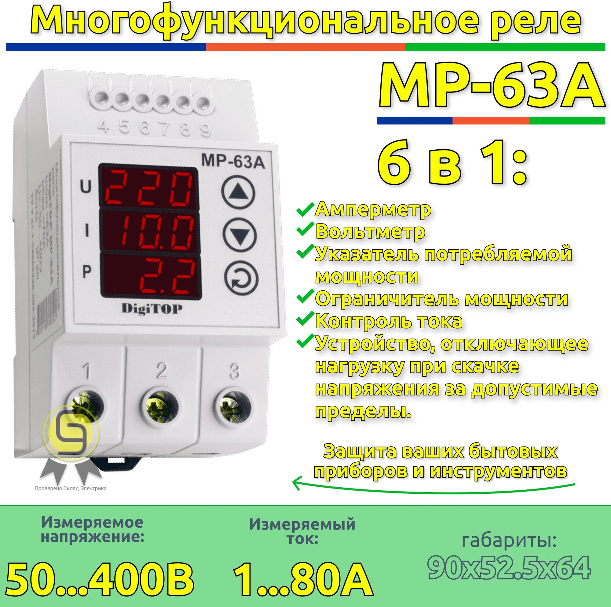 DigiTOP Mp-63а Реле многофункциональное на DIN-рейку, 0-400В, макс. 80А, 5-600 сек.