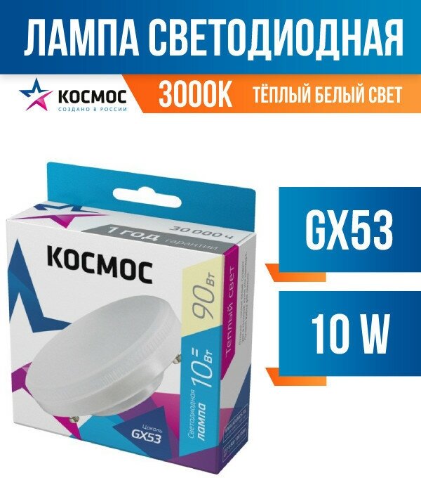 Лампочки светодиодные Космос 10Вт GX53 (аналог 90Вт) Теплый свет, 1 шт.