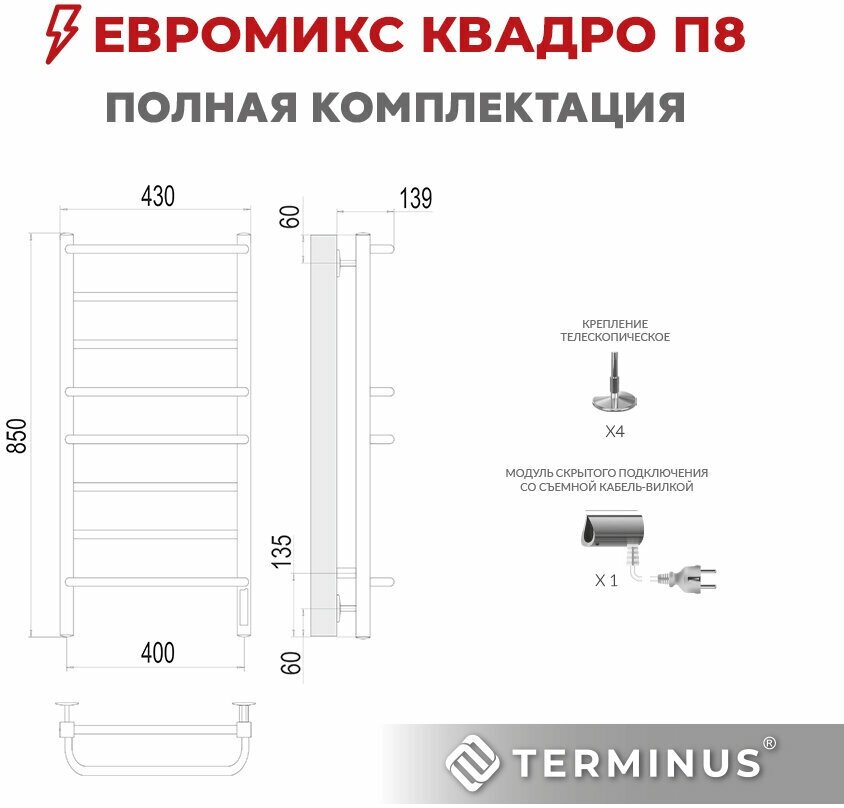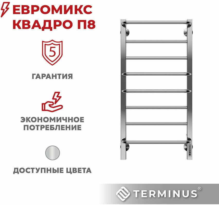 Полотенцесушитель электрический TERMINUS (Терминус) Евромикс квадро П8 400х850 мм, сверхпрочная пищевая нержавеющая сталь, диммер 5-ого поколения Quick Touch, гарантия 5 лет/ Электрический полотенцесушитель с терморегулятором
