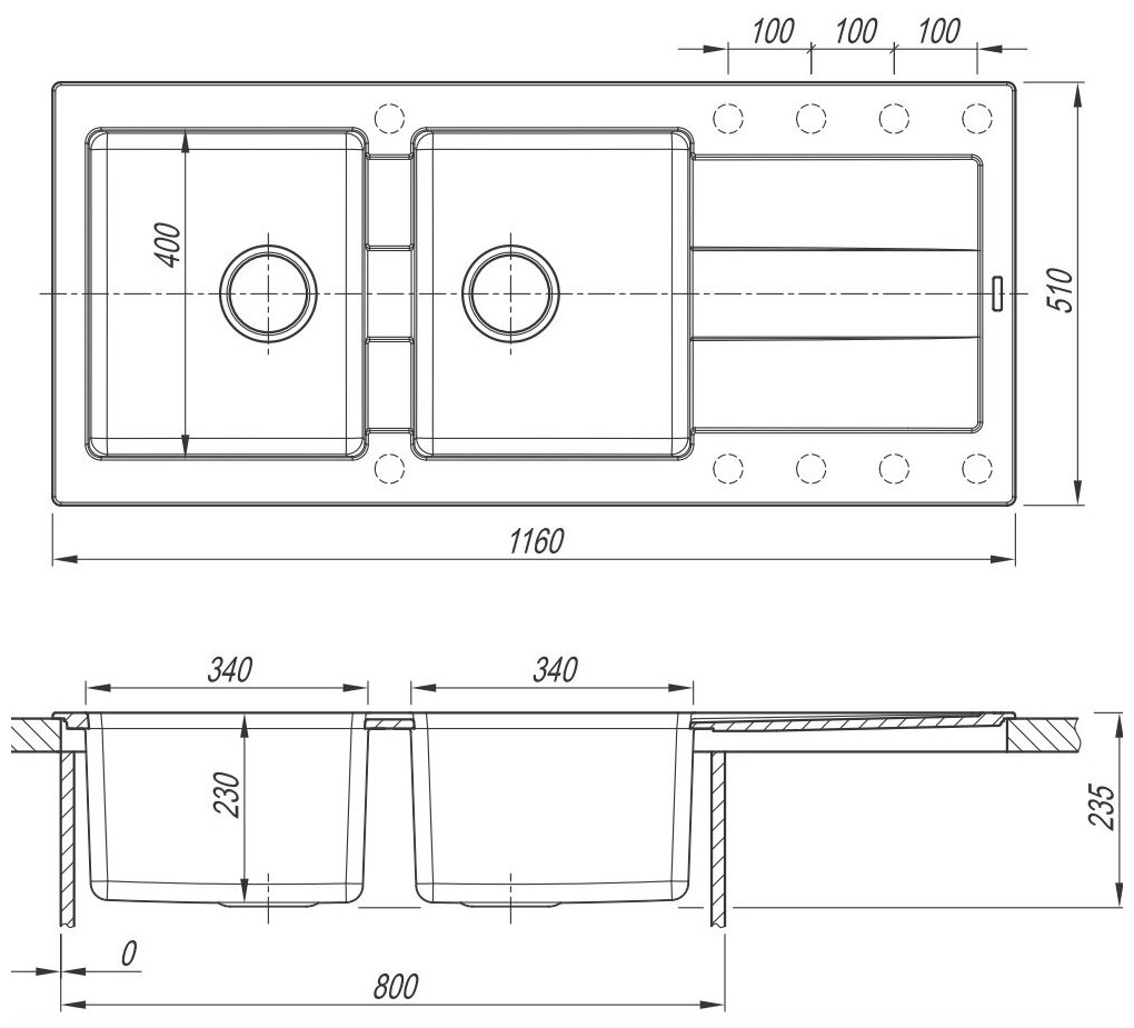 | Размеры врезного отверстия (накладная) | 1140x490 мм (угловой радиус врезки 18 мм) |