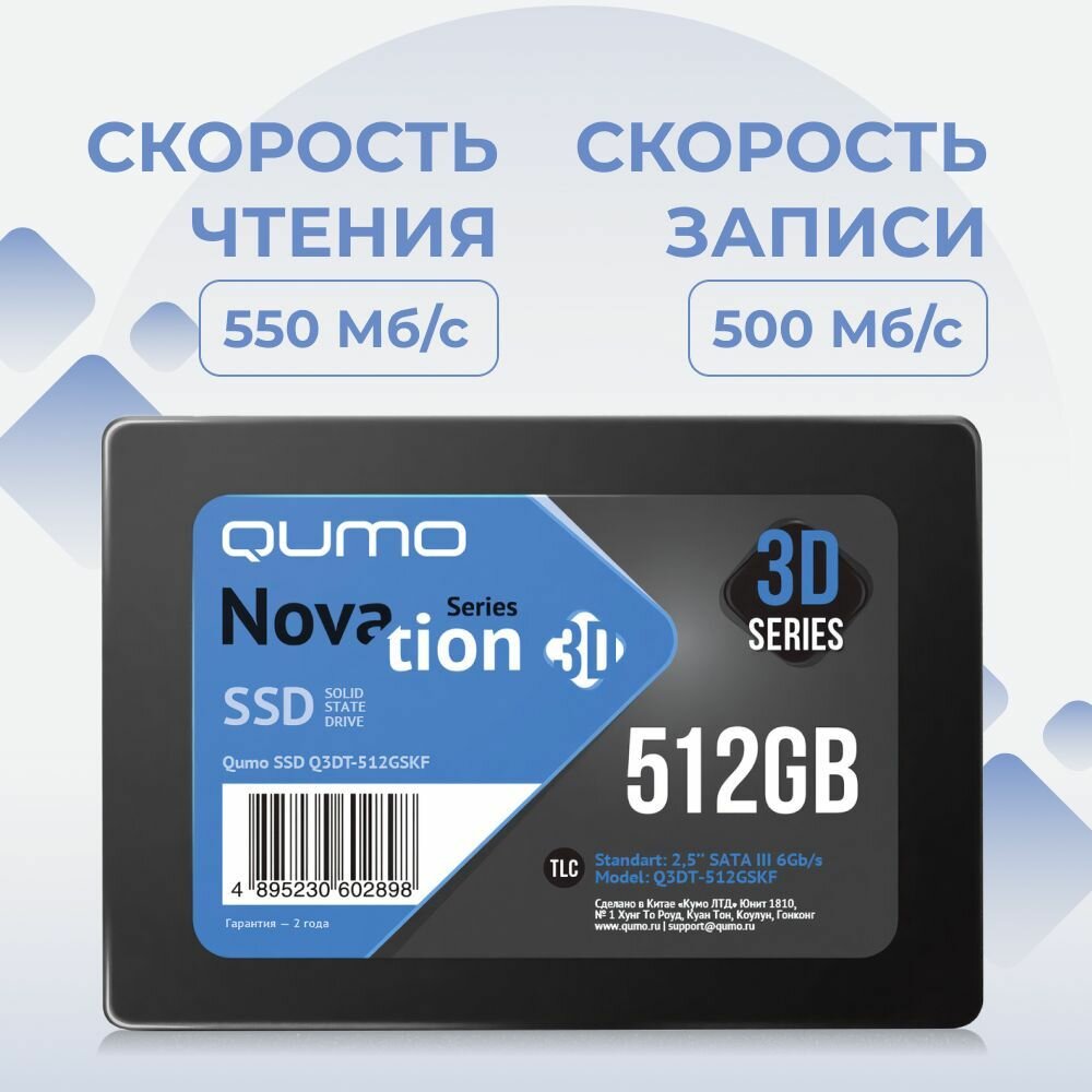 SSD-накопители SSD 2.5' Qumo Novation 3D, 512Gb, 3D Tlc, Q3dt-512gskf, R550Mb/s, W500Mb/s, 240TBW, OEM